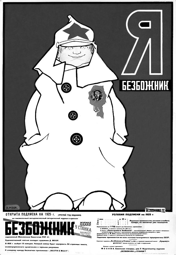 «Я – безбожник. Открыта подписка на ежемесячный антирелигиозный сатирический журнал в красках “Безбожник у станка”» Дмитрий Стахиевич Моор (Орлов) (1883–1946), плакат, 1924.