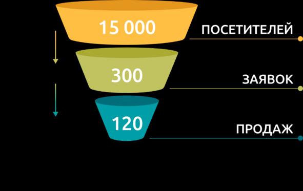 Я хочу делать 120 продаж, поэтому путем нехитрых вычислений получаем, что надо делать 300 заявок с сайта и 15 000 посетителей приводить на сайт.
