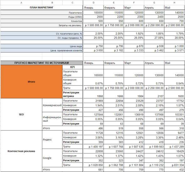 Я сразу скажу, что на старте вы не угадаете откуда и сколько придет посетителей. Вы и потом можете только прогнозировать. Но тот день, когда вы начнете подходить к маркетингу системно и будете заполнять данные хотя бы раз в месяц, будет для вас шагом в сторону результата. Вам нужно наблюдать, сколько людей приходят к вам с того источника и с другого. И с какой конверсией конвертируются в заявки. Наблюдения позволят вам принимать решения, где можно что-то улучшить и какие ресурсы задействовать. Вот только тогда у вас должен рождаться план действий и задание исполнителям.