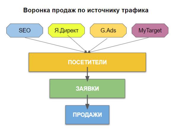 Люди искали что-то в интернете и наткнулись на ваше предложение. Они перешли по нему и попали к вам на сайт. У вашего сайта есть общая конверсия, а есть конверсия в разрезе типа трафика.