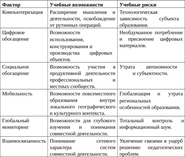 Как показано в таблице, использование образованием возможностей, связанных с факторами компьютеризации, цифрового и социального обогащения, мобильности, глобального мониторинга и всеобщей взаимосвязанности, сопряжено с определенными рисками. Однако гораздо больший риск связан с недооценкой перечисленных факторов и отказом от форм деятельности, основанных на учете указанных факторов. Возможности, которые открываются перед сферой образования, носят характер системных требований, отказ от которых фактически будет означать отторжение от системы современной деятельности.