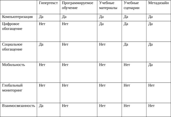 Был проведен сравнительный анализ существующих направлений педагогического дизайна с точки зрения того, насколько они отвечают тем факторам, которые были выделены во втором параграфе первой главы исследования. Направление использования гипертекстовых систем учитывает использование компьютерных технологий, социальное обогащение деятельности и фактор взаимосвязанности. Но это направление не учитывает цифровое обогащение деятельности, мобильность и глобальный мониторинг деятельности. Направление программируемого обучения учитывает использование компьютерных систем, но не принимает во внимание цифровое и социальное обогащение деятельности, мобильность, глобальный мониторинг деятельности и взаимосвязанность. Направление разработки учебных материалов учитывает использование компьютерных технологий и цифровое обогащение деятельности, но не уделяет достаточного внимания социальному обогащению деятельности, мобильности, глобальному мониторингу деятельности и взаимосвязанности. Направление разработки сценариев учебной деятельности уделяет внимание использованию компьютерных технологий, цифровому и социальному обогащению деятельности, но не учитывает мобильность, глобальный мониторинг деятельности и взаимосвязанность. Направление дизайна соучастия или метадизайна уделяет большое внимание компьютерной поддержке самостоятельной деятельности, цифровому и социальному обогащению и учитывает мобильность. Однако и это направление не учитывает глобальный мониторинг деятельности и взаимосвязанность деятельности.