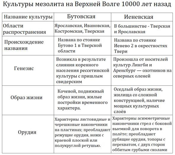 С отступлением ледников пришла эпоха мезолита. На всём Верхневолжье мезолитических стоянок около семидесяти, но все они представлены всего двумя культурами — бутовской и иеневской.