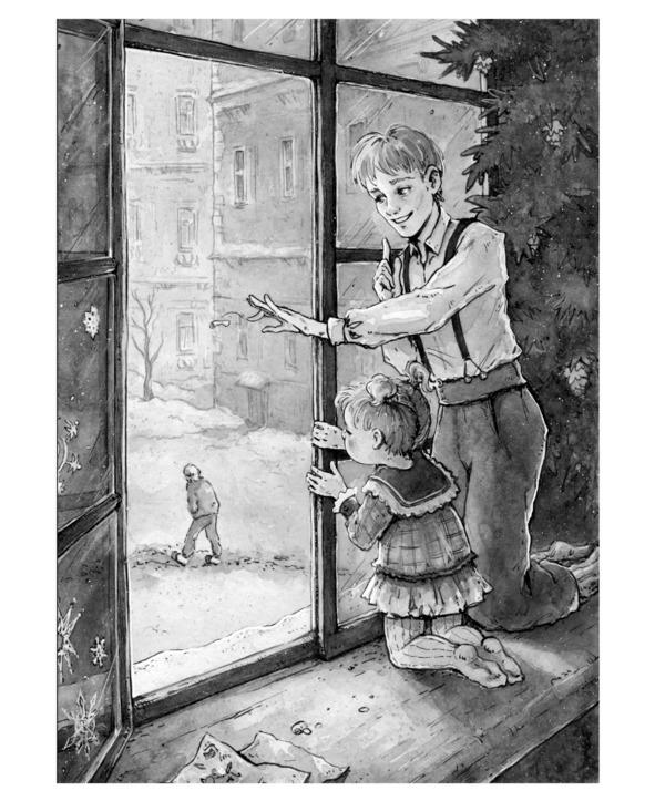 Я буквально сполз по лестнице вниз и тихо подобрался к тяжёлым створкам входной двери, покрытым многочисленными слоями облупившейся краски. Пушистые хлопья снега плавно кружили по двору. Они опускались и вдруг взлетали вновь, чтобы снова опускаться на землю и собираться в мягкие сугробы. На фоне этого белоснежного великолепия, обещавшего мне весёлые игры с санками и снежками, стояла тёмная фигура мужчины в отличном, идеально скроенном чёрном пальто, в высоком старомодном цилиндре и с маленьким чёрным чемоданом в руках.