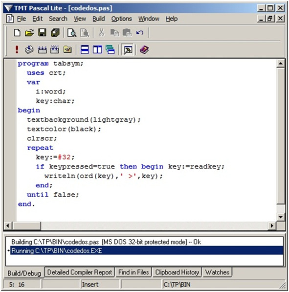 Строка «If keypressed=true» — «Если нажата клавиша», то переменной «key» присваивается символ нажатой клавиши «readkey». Затем, мы выводим на экран значение символа в таблице (функция ord) и сам символ (key).