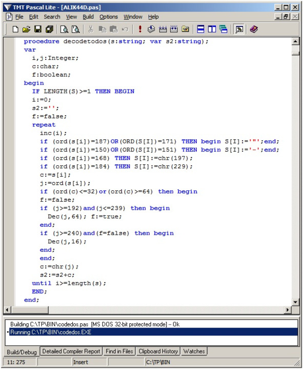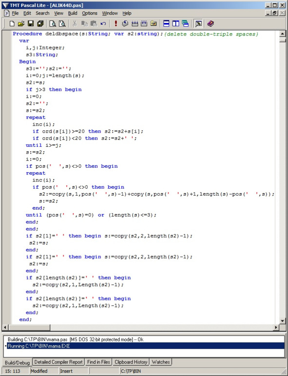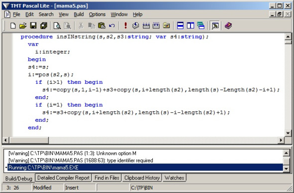 Все приведенные в качестве примера процедуры и функции реализованы на языке Pascal, а точнее, в бесплатном компиляторе TMT Pascal lite.[11] Выбор автора оказался на стороне этого компилятора отнюдь не случаен. Это один из немногих компиляторов Паскаля, позволяющих использовать во внутренних процедурах и функциях входные и выходные массивы переменных строчного, логического и целочисленного типа.[12] Кроме того, TMT Pascal известен, доступен и понятен настолько, что строить простые программные модели, обрабатывающие строковые массивы данных не доставит большого труда.