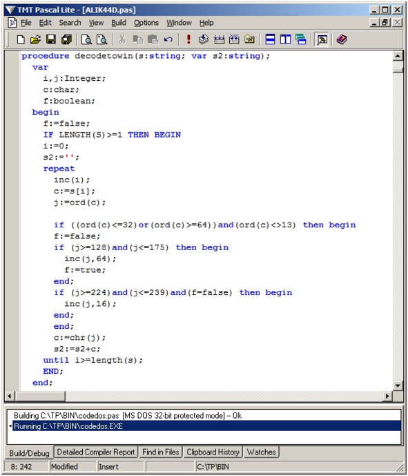 Для перекодировки строки текста из кодировки Win в DOS нам потребуется следующая процедура DecodeToDOS: