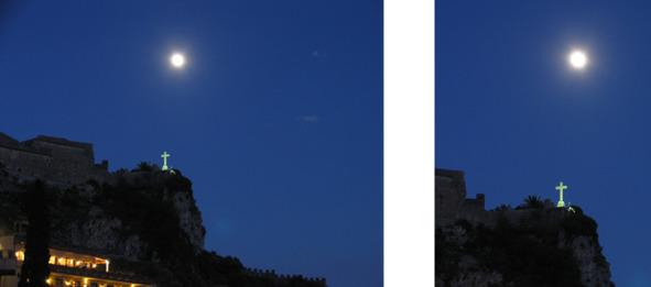 Но лучше один раз увидеть, чем читать мое занудство. Фотографию в этой записи я сделал ночью в окрестностях сицилийского города Таормина. Под освещенным крестом на склоне горы был отель, который я не смог обрезать во время съемки. Нужен ли он на фото? Если ваша задача рассказать про этот отель, то оставляйте. Если хотите подчеркнуть романтичность сицилийской ночи, то отель надо убрать. Что и сделано на втором снимке. Можно спорить сколько неба и скалы оставить на фото, но главную идею (убрать отель) я продемонстрировал.