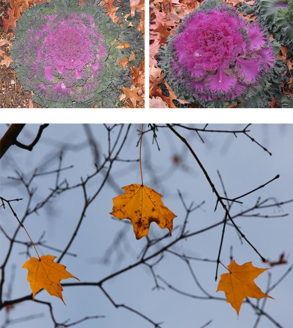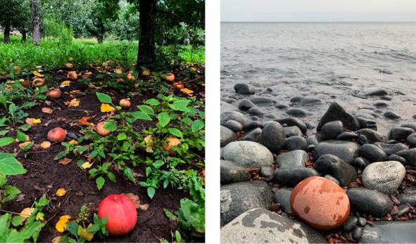 В приведенных примерах передними планами служат крупное красное яблоко и красный камень среди своих серых собратьев.