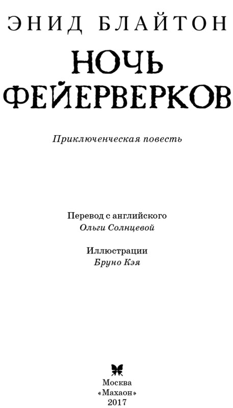 Ночь фейерверков : приключенческая повесть / Энид Блайтон ; пер. с англ. О. М. Солнцевой ; худож. Бруно Кэй. – М. : Махаон, Азбука-Аттикус, 2017.