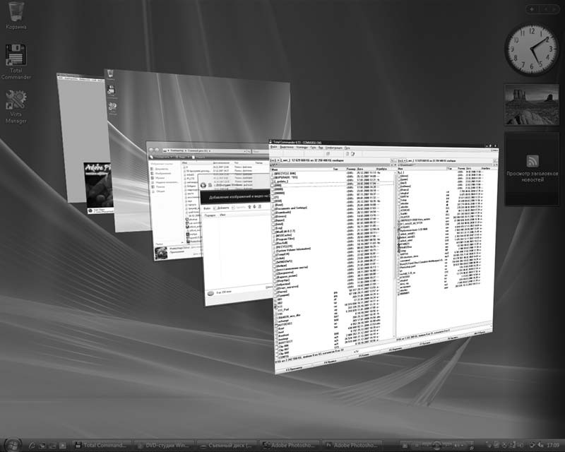Windows Aero предоставляет новый способ переключения между открытыми окнами. Ранее это было сочетание клавиш Alt+Tab. Оно работает и в Windows Vista, однако при активизированном интерфейсе Aero в окне списка открытых окон отображаются не значки запущенных приложений, а эскизы их окон (рис. 1.1).