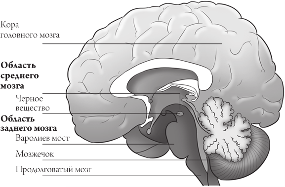 Средний мозг задействован во многих физических движениях. Одно из его центральных образований – это черное вещество, названное так потому, что является богатым источником нейромедиатора дофамина, который после смерти окрашивает ткани в черный цвет. Так как дофамин важен для координации движений, говорят, что черное вещество «смазывает колеса движения». Помимо этого дофамин – нейромедиатор-«награда», необходимый для многих форм обучения, импульсивного поведения и формирования зависимости.