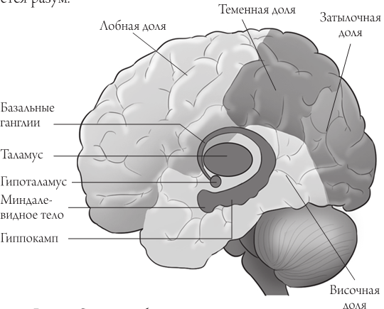 Каждое полушарие коры имеет четыре основные доли (см. рис. 1.3). Лобные доли содержат нейронные связи для мышления и планирования и, как считается, отвечают за нашу индивидуальность. Затылочные и височные доли в основном заняты обработкой визуальной и слуховой информации соответственно. Теменные доли задействуют внимание и объединяют сенсорную информацию.