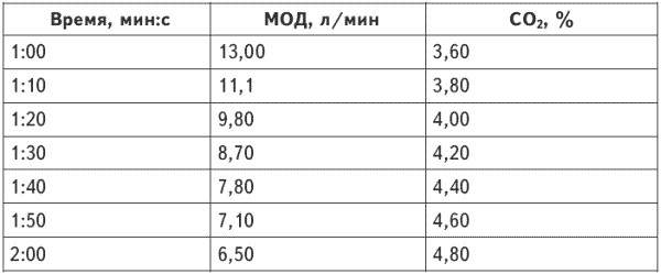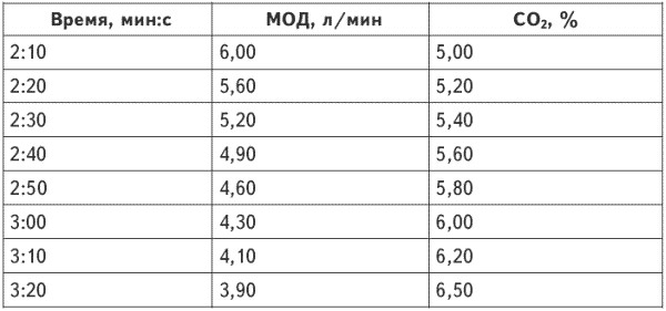 Таблица 2. Минутный объем дыхания и содержание CO2 в артериальной крови