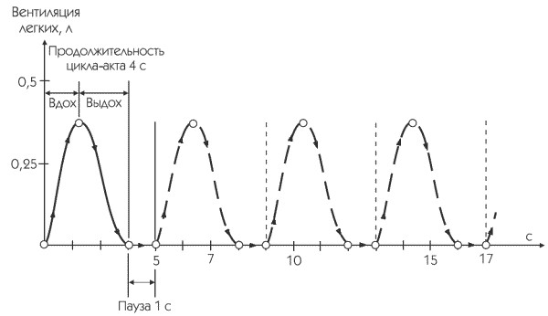 Дыхание представляет собой непрерывную череду циклов «вдох/выдох». Между вдохами и выдохами организм может самопроизвольно включать паузы. На рис. 1 представлен весьма распространенный у людей, пребывающих в состоянии спокойного бодрствования, дыхательный цикл из трех фаз: вдох + выдох + пауза, продолжительность которого равна 4 с (частота дыхания 15 ц./мин). Величина паузы «на выдохе» – около 1 с.