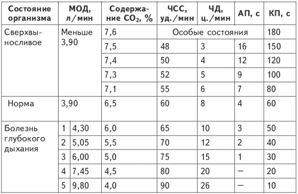 В табл. 1 имеется новый показатель здоровья дыхательной системы – это контрольная пауза (КП). К. П. Бутейко полагал, что содержание углекислого газа в крови определяет раскрытие сосудистого русла и степень свободы кровообращения. Лабораторное определение содержания углекислого газа в крови малодоступно. В этой связи он разработал экспресс-определение, которое можно выполнять самостоятельно в бытовых условиях, – это тест «контрольная пауза». Пользуясь созданной К. П. Бутейко шкалой, можно найти по КП содержание CO2.