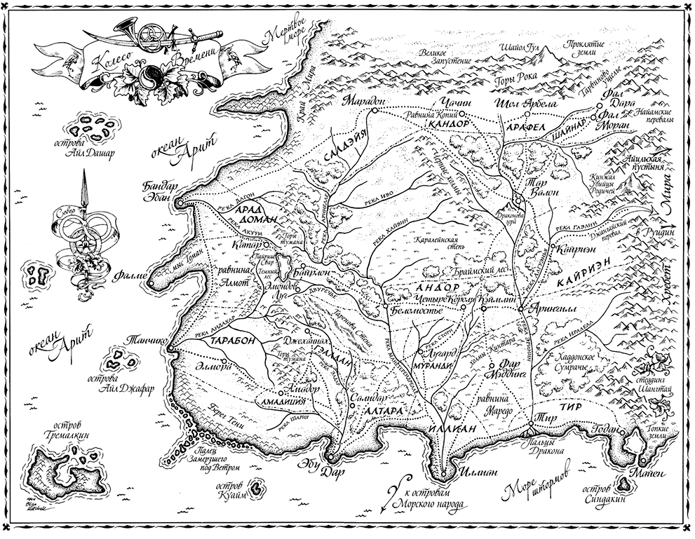 Солнце еще только начало взбираться по небосклону, и от Галада и трех его вооруженных спутников протянулись вперед длинные утренние тени. Деревья вокруг стояли густо — дубы и болотные мирты, сосны и сургамы-кислокамедники, и на большинстве виднелась рыжеватая весенняя поросль. Всадники рысью двигались по проходившей прямо через лес дороге, и Галад старался выбросить из головы все ненужное, успокоить разум, но постоянно мешала какая-то мелочь. В царящей под лесным пологом тишине раздавался лишь приглушенный стук копыт. На ветвях не чирикали птицы, не пересвистывались белки. Слишком тихо для этого времени — лес будто бы затаил дыхание и замер. Некогда, задолго до возникновения Амадиции и Тарабона, тут пролегал оживленный торговый тракт, и из-под желтоватой глины, наезженной и утоптанной до твердой корки, кое-где проглядывали остатки древних камней, которыми он был вымощен давным-давно. Вокруг, не считая всадников, не было видно ни единой живой души — только очень далеко впереди одинокую фермерскую телегу медленно тащил куда-то вол. Пути торговых караванов сместились намного севернее, деревни и фермы обезлюдели, а мифические заброшенные копи Айлгара так и оставались позабыты среди горных кряжей, нагромождения которых начинались всего в нескольких милях южнее. В той же стороне небосвода сбивались в кучу, предвещая ненастье, темнеющие облака; если они продолжат свое неспешное наступление по небу, то во второй половине дня прольется дождь. Над кромкой деревьев, вокруг прогалов у лесной опушки, выписывал петли краснокрылый ястреб. Он тоже охотится, как и сам Галад. Но действовать Галаду в своей охоте придется в душе, а не на лесной опушке.