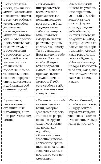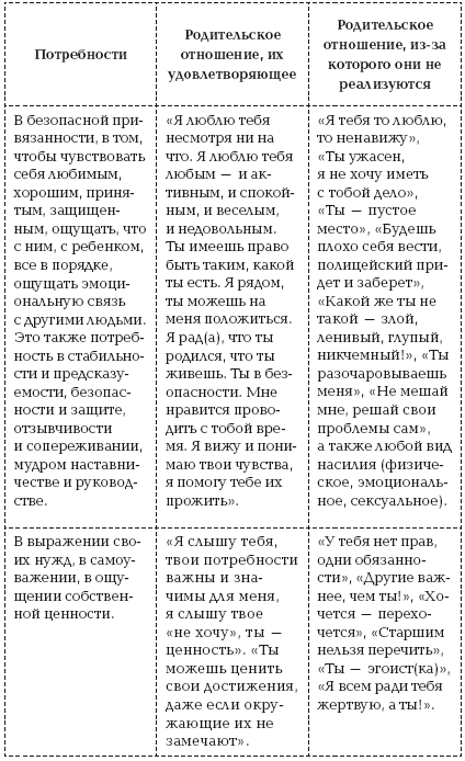 3. Еще одна система потребностей, которую очень легко держать в голове и с которой удобно сверяться. В психологии есть такое направление – схема-терапия. Ее создатель Джеффри Янг и его последователи говорят о том, что ключевых потребностей у ребенка пять. Ниже в таблице приведены не только эти потребности, но и примеры родительского отношения и посланий, которые, в частности, удовлетворяют и не удовлетворяют их.