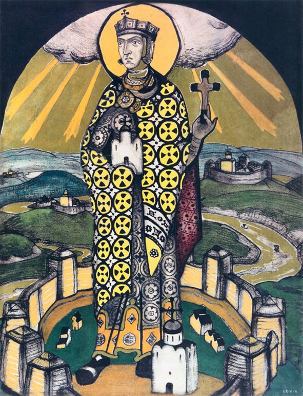Существенно иное впечатление производит портрет княгини Ольги, написанный в 1915 г. Н. Рерихом. Несмотря на то, что в композиции и деталях рисунка хорошо заметны иконописные мотивы, в ней отсутствует характерная для икон благостность и мягкость изображения. Оно подчеркнуто резкое по тональности и графике. Выражение лица Ольги говорит о ее жестокости, крест воспринимается как орудие наказания, которое рука держит совершенно неестественным и демонстративным жестом. Даже навязчивые стены, окружающие все постройки воспринимаются как знак, что Ольга находится в состоянии конфликта с окружающими и отгораживается от них.
