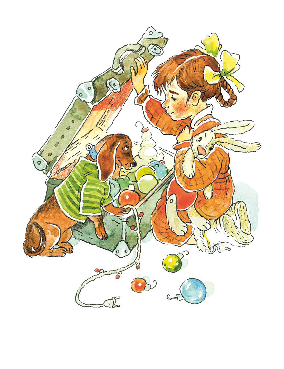 За два дня до Нового года, поздно вечером, Хвостик — она же Соня — села рядом с чемоданом со старыми ёлочными игрушками и открыла крышку. Какие же они были красивые — блестящие шары и шишки, смешные зайцы, снеговики и бумажные снежинки. Всё просилось в руки.
