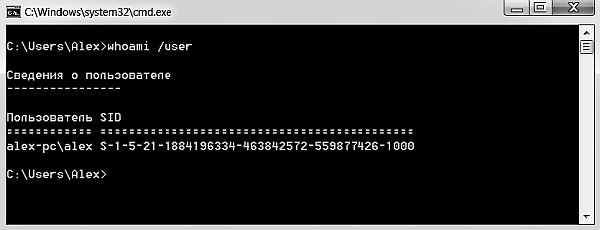 Также в разделе HKEY_USERSможет находиться несколько подразделов с наборами цифр. Длинный набор цифр – это SID (идентификатор безопасности). Идентификатор безопасности присваивается каждой учетной записи, поэтому количество таких подразделов зависит от количества пользователей, когда-либо входивших в систему. Чтобы узнать, свой SID в системе, можно использовать несколько способов. Например, можно запустить утилиту командной строки whoami.exe, которая входит в состав Windows 7, с параметром /user: