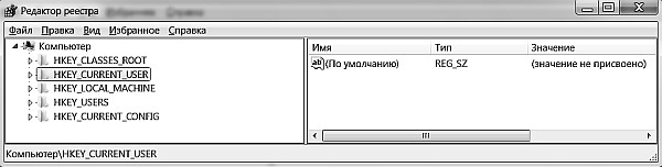 Раздел HKEY_CURRENT_USERсодержит информацию о пользователе, работающем с Windows 7 в текущем сеансе, а также о различных настройках системы, относящихся к текущему пользователю: вид Рабочего стола, настройки экрана, принтера, параметры применяемых программ.