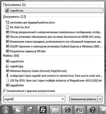 Итак, если реестр – это база данных Windows, то нужен определенный инструмент для работы с данной базой. Таким инструментом в Windows является Редактор реестра. Обратите внимание, что ярлык данной программы вы не найдете на Рабочем столе, а также в меню кнопки Пуск. Обычный пользователь не должен знать о существовании данной программы. Поэтому поступим следующим образом. Нажмем кнопку Пуски в строке поиска наберем слово regedit. Вы увидите в разделе Программыпункт regedit.exe(рис. 1.1). Это и есть файл редактора реестра Windows, которым мы будем пользоваться на протяжении всей книги.