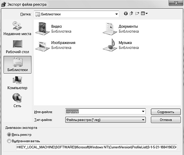 Для того чтобы экспортировать только выбранный раздел реестра, достаточно щелкнуть по нему правой кнопкой мыши и выбрать из контекстного меню команду Экспортировать. Появится уже знакомое нам диалоговое окно, в котором переключатель автоматически будет стоять в позиции Выбранная ветвьи в текстовом поле будет указан полный путь к разделу.