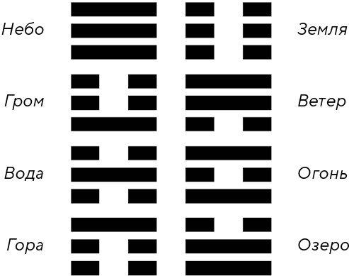 Сплошные или прерывистые линии яо составляют систему. Комбинации этих линий образуют знаки гуа, которые в зависимости от количества входящих в них черт могут представлять собой диграммы (две черты), триграммы (три черты) и так далее. Восемь триграмм, составленных из различных комбинаций яо, дали начало космологии, олицетворяя собой различные стихии и явления природы.