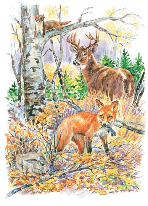 Лес – это большой дом для самых разных животных. Как и любой многоэтажный дом, он состоит из нескольких ярусов. Первый ярус образуют самые высокие деревья: ели, сосны, берёзы. Второй ярус сложен деревьями средней величины: рябиной, козьей ивой, на юге – полевым клёном, лесной яблоней. Ниже идут ярусы кустарников, трав и кустарничков, мхов. За счёт этого на одной и той же площади удаётся разместить много видов животных – вот почему лес такой богатый!