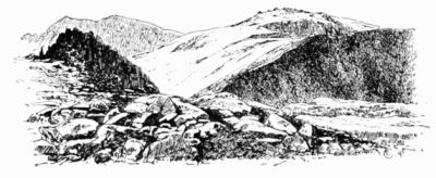 A less popular route, but perhaps shorter and more easily found in mist, and certainly more effective in point of scenery, leaves the highroad about a furlong short of Ogwen Lake. Pass a farm and follow a stream for a mile up to Ffynnon Lloer; from the head of the pool pick your way through some rough ground to the left hand up on to Braichddu, when the view of the Glyders bursts upon you suddenly with great effect, and, on turning to the right to make the final mount to the Carnedd, some good peeps may be had down the confused rocks of Craig yr Ysfa.