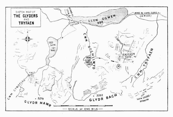 Benglog, at the foot of Llyn Ogwen and the head of Nant Ffrancon, is only second to Penygwrhyd as a climbing centre, but, unfortunately, the accommodation is so very scanty—Ogwen Cottage, the only house, having no more than two bedrooms—that the place is little used. For Tryfaen, the Glyders, the Carnedds, Twll Du, and the Elider range it is preferable to any other place, and beautiful problems are to be found by the climber literally within a stone's throw of the door. It is about 5 miles from Bethesda station on the north and the same distance from Capel Curig on the east, all three places being on the great Holyhead Road. Penygwrhyd is 2 hours away, whether by road (9 miles) or over the hill. In the latter case the shortest route is by the col which separates Tryfaen and Glyder Fach, and then over the shoulder east of the latter mountain. To Llanberis the way lies by Twll Du and Cwm Patric, and though much longer than the last could probably be done in nearly as short a time.