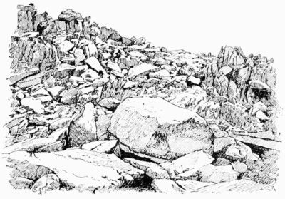 The Scilly Isles, again, are by no means to be despised by climbers, especially by such of them as can enjoy knocking about in a small boat, which is almost the only means of getting from climb to climb. The granite forms are somewhat wilder and more fantastic than those in the Channel Islands. Peninnis Head is only one of many capital scrambling grounds. An article by Dr. Treves [1] gives a very good idea of the kind of thing which may be expected. If anyone should think of proceeding, under the guidance of this volume, to regions with which he is so far unacquainted, he will naturally ask how the climbing here described compares with the climbing in other parts of Britain or of Europe. How does Wales, for instance, stand with regard to Cumberland or the Alps? On this point some good remarks will be found in the Penny Magazine, vii., p. 161 (1838), where the writer assigns to the more northern hills a slight superiority over Wales. An impression prevails among those who know both that the weather of N. Wales is, if possible, more changeable than that of the Lakes. Climbers will notice this chiefly in winter, when the snow on the Welsh mountains less frequently settles into sound condition. Perhaps sudden changes of temperature are partly to blame for the greater frequency in Wales of deaths from exposure. Winter climbing is very enjoyable, but proper precautions must be taken against the cold. A writer on Wales some 300 years ago observes that 'the cold Aire of these Mountainous Regions by an Antiperistasis keeps in and strengthens the internall heat;' but a good woollen sweater, a warm cap to turn down over the ears and neck, and three pairs of gloves, two pairs on and one pair dry in the pocket, will be found quite as effectual. Dangers, however, cease not with the setting sun, and many who have defied frost-bite during the day fall an easy prey to rheumatism in bed at night. A groundless terror of the Welsh language keeps many away from Wales. The names are certainly of formidable appearance, and Barham's lines are hardly an exaggeration.