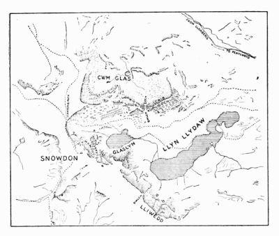 The route from Capel Curig is very easily found. Three and a half miles along the Bangor road, after crossing the river Llugwy, and just before a chapel, a path strikes off on the right-hand side towards a farmhouse. Half a mile along this path strike up the hill to the left, travelling at first about north by compass, and afterwards, as the hill is mounted, inclining more to the west.