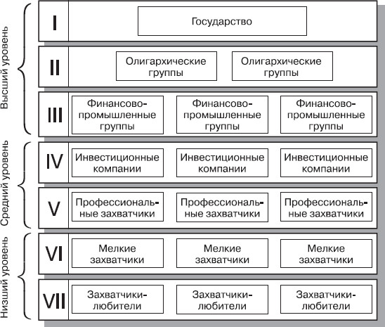 К захватчикам высшего уровня, кроме государства, относятся также олигархи и финансово-промышленные группы (ФПГ). По большому счету, у нас в стране очень сложно представить раздельное существование этих трех групп захватчиков. В большинстве случаев они имеют взаимопроникающую структуру (ФПГ внедряется в государство и наоборот, олигарх также старается создать собственную империю – финансовую группу – и завоевать расположение государственных мужей).