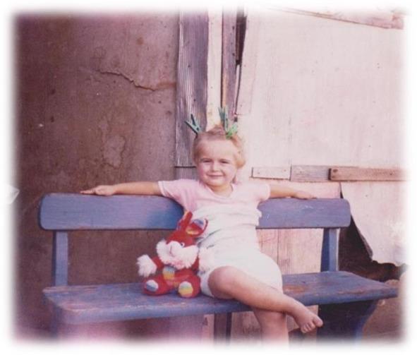 Ксения возле гаража в своей любимой деревне Приречное (3 года)