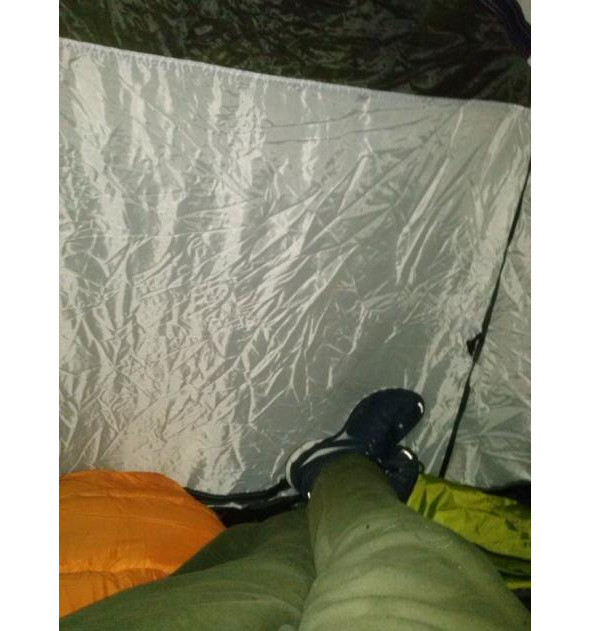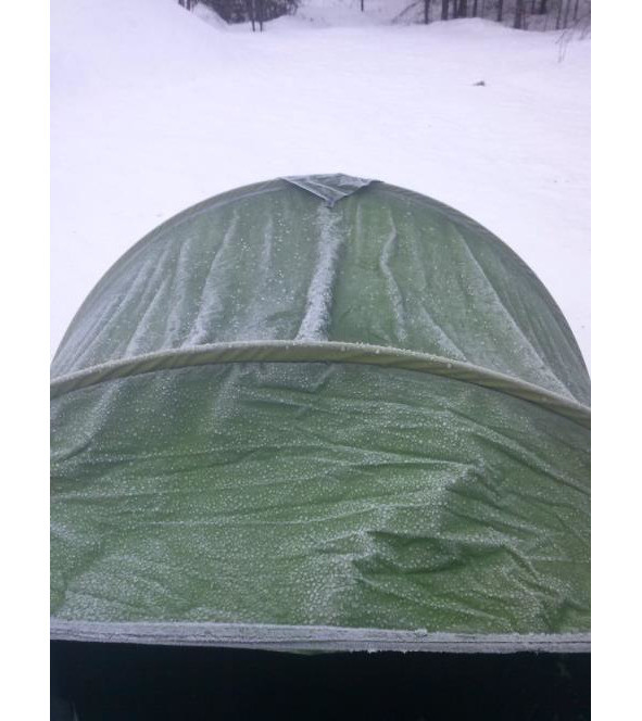 Тренировки на этом не закончились, когда обзавёлся само разборной палаткой, трюк повторился. На крыше моего домика изнутри иней, спал в балаклаве, чтобы нос меньше мёрз. Залезть полностью можно, но дышать в синтетике нечем, приходится менять позиции.