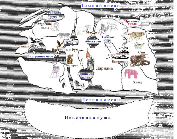 Так закончилась первая звериная битва, и так Земля распростерлась по всей суше. В тех местах, где обосновались бывшие обитатели сада, возникли со временем государства. На северо-западном берегу Внутреннего моря образовался Рум, на северо-восточном — его придаток Восточная Румийская империя. На берегах северного моря установилось королевство Северных Львов, которые сами себя называли «морскими». На южной равнине не возникло никакой державы, но там вольными прайдами стали хозяйничать потомки первых львов. Восточнее изначальной Земли укрепилась Дариана, и ей подчинялись четыре других государства: Согд, Бактриана, Хозр и Маргилана. Южнее последних, за неприступными кряжами Крыши Мира руками отважных первопроходцев был воздвигнут Хинд. В степях севернее Абескурана и на берегах Соленного озера образовалась конфедерация кочевых племен Массагето, что в переводе с языка кочевников означает «от семени коня». На восток от них укрепились сарматы (те же лошадники), а еще восточнее, за Драконьей грядой — северные волки. К югу от них правили волки Малой стаи. Последним удалось подчинить своей власти племена фаунов, что в переводе означает «потомки дракона», и создать свою державу — Син. А на месте изначальной Земли возникло маленькое княжество Терзерум — «Земля обета». Просуществовав недолго, оно досталось сначала Западному Руму, позже — Дариане, а в конце — Восточным руминам.