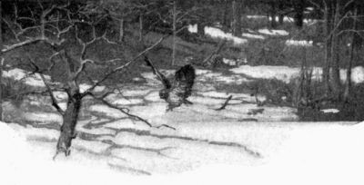 But the crows sleep on, however high the winds. They sit close to the branches, that the feathers may cover their clinging feet; they tuck their heads beneath their wing-coverts, thus protecting the whole body, except one side of the head, which the feathers of the wing cannot quite shelter. This leaves an eye exposed, and this eye, like the heel of Achilles, proves to be the one vulnerable spot. It freezes in very severe weather, causing a slow, painful death. In the morning, after an unusually cold night, you can find dozens of crows flapping piteously about in the trees of the roost and upon the ground, with frozen eyes. In January, 1895, I saw very many of them along the Hollow, blind in one eye or in both eyes, dying of pain and starvation. It was pitiful to see their sufferings. The snow in places was sprinkled with their broken feathers, and with pine-needles which they had plucked off and tried to eat. Nothing could be done for the poor things. I have tried time and again to doctor them; but they were sure to die in the end.