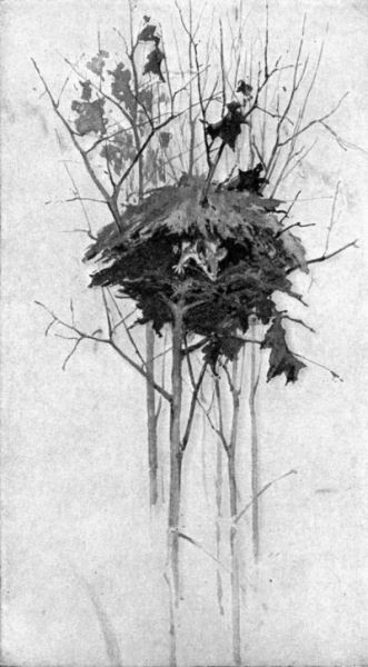 Here, in the swaying tops, amid the heavy roar of the winds, they sleep. You need have no fear of waking them as you steal through the shadows beneath the trees. The thick mat of needles or the sifted snow muffles your footfalls; and the winds still the breaking branches and snapping twigs. What a bed in a winter storm! The sky is just light enough for you to distinguish the dim outlines of the sleepers as they rock in the waves of the dark green that rise and fall above you; the trees moan, the branches shiver and creak, and high above all, around and beneath you, filling the recesses of the dark wood rolls the volume of the storm.