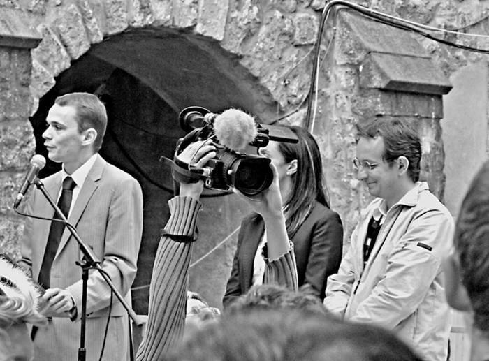 Юрий ОДНОПОЗОВ. Вот о ком можно было бы написать отдельную главу! Он возник по рекомендации Валерия Спирина, режиссера фильма «Одноэтажная Америка», который, к нашему большому сожалению, с нами поехать не смог. Итак: роста он среднего, телосложения плотного. Крупная голова с редеющими черными волосами. Мощные надбровные дуги, из-под которых внимательно и чуть насмешливо смотрят черные глаза. Лицо приятное, с четкими, хотя и не крупными чертами. Прелестная, хотя появляется она редко, улыбка. Говорит Юра мало, к тому же говорит не столько словами, сколько руками. Пытается жестами прояснить смысл сказанного. Например, вот он машет руками: «Ну, надо… это… довести, чтобы…» – и не просто машет, руки у него в это время плывут по воздуху, как бы описывая, что стоит за этим маловразумительным предложением. Вегетарианец. Лучше помрет от голода, нежели съест что-нибудь животного происхождения. В случае необходимости может работать круглосуточно. О том, как одевается Юра, хочется сказать отдельно. Обычная его форма во Франции была такой: рваные джинсы, кроки фиолетового цвета, расписной T-Shirt. Эти предметы не снимались никогда. Шли ли съемки в театре, в здании Национальной ассамблеи Франции – это было неважно. И еще: Юра совершенно неконфликтный человек, всегда старается найти общий язык со всеми, никогда не повышает голос. И наконец, превосходный режиссер. Но при всем при этом, «вещь в себе», человек, живущий сугубо по собственным стандартам. Вы бы назвали своего сына Будимиром? А он назвал. Что будет с мальчиком, когда он пойдет в школу, даже боюсь подумать. И еще: над Юрой много шутили, в ответ на что он мягко улыбался, и только. Упрям до умопомрачения.