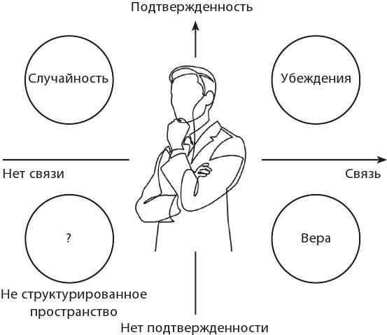 Итак, у нас есть некий опыт. У опыта есть подтверждение. С противоположной стороны опыта будет отсутствие опыта, а с противоположной стороны подтверждения – отсутствие подтверждения. К чему относится случай «я разжал пальцы, и маркер упал вниз»? Я сделал так один раз, второй, тридцатый. И так будет продолжаться, потому что законы гравитации мы не сможем нарушить. Это и есть убеждение. Убеждение имеет двоичную структуру. У нас есть опыт, а у опыта есть подтверждение.