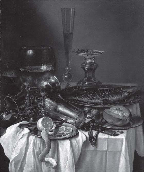 3. В центре картины непременно стол, чья плоскость занимает собой практически все пространство от «стены» (фона) до переднего плана, самого ближайшего. Стол в обеденной или кухонной зале или вынесенный на самый берег моря – опора в архитектонике образа, место, где может состояться явление, если угодно, событие натюрморта. Перед нами всегда куча «мертвых» вещей или предметов, по традиции жанра в натюрморте не может быть одушевленных предметов. Добавлю, даже если некоторые из них изображены так, что бывает трудно установить, относятся ли они к порядку живых существ или мертвых. Я же думаю, что «мертвая природа» потому и мертва, что может составиться в натюрморт. Почему-то не вызывают желудочной радости эти столы в домах богатых голландских буржуа середины XVII века, заваленные пищевыми припасами. Изобилие еды – еще не еда. На столе опрокинутый кувшин или громоздкий бокал, рядом на подносе зажаренная рыба, но как будто еще не тронутая; здесь также кулек с перцем (или чем-то еще), солонка, небрежно брошенный столовый нож, иногда он опасно свисает с угла стола и вот-вот упадет. Расколотые орехи, персики, громадный кусок ветчины или баранья нога, гирлянда листьев, отгоревшая свеча, подхваченная массивным канделябром, – все сообщает о завершении дня (прошедший «ужин», например). На других натюрмортах остатки обеда или завтрака: большой разломанный хлеб, омары и крабы на широких серебряных блюдах, крупный виноград, весь в ярких блестках и, конечно, вино в высоких прозрачных изящных сосудах, или в низких и громоздких, украшенных драгоценными камнями, некоторые из них пусты, другие, опорожненные, валяются как придется, ожидая уборки стола. Только ограниченное число предметов сохраняет устойчивость. Бывает и что-то удивительное, словно перепрыгнув эпохи, мы оказываемся в начале сюрреалистической революции. Передний план занимает громадная рыба на берегу моря (как у Рене Магритта) – здесь натюрморт образует некое симбиотическое целое с пейзажной перспективой, рассказывается чуть ли не рыбацкая история. На самом деле – смена оптических возможностей и их усложнение. Другой масштаб. Бесспорно, что натюрморты в границах жанра или жанровых сочетаниях могут быть четко различимы. Современного человека привлекает вид приготовленных блюд («благородных яств»), ему свойственна привычка к предвкушению того наслаждения, которое он сможет получить. Недаром же мировая сеть закусочных Макдональдс рекламирует готовые к потреблению изделия, а не исходные материалы: не изображения молодого бычка, колосьев зрелой пшеницы, свежих яиц, бутылок изысканного растительного масла и приправ. Интерес вызывает сам артефакт («полуфабрикат»), т. е. вещь, существующая лишь во времени ее потребления («медленного или быстрого»). Сама по себе вещь неинтересна. Можно сказать, что эпоха вещей закончилась, и сегодня мы уже не знаем, что такое вещь. В традиционном понимании вещь может использоваться, служить, «стареть», но уж никак не может быть разрушена разовым потреблением. Как не заметить в этом огромном количестве праздников «кухни», «обеда», «завтрака», «битой дичи» или «охотничьих трофеях» той роскоши, богатства и благополучия, изобилия жизни, которыми был зачарован состоятельный бюргер. Вот эту новую гедонистическую философию вещи и закрепляет голландский натюрмор