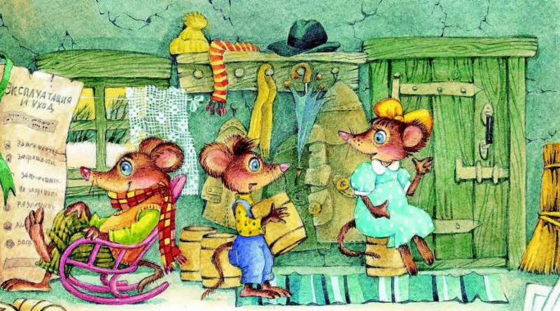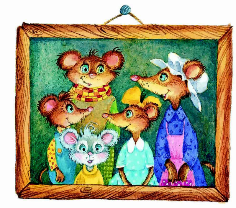 Одуванчику очень хотелось похвастаться перед старшими братом и сестрой, но он молча полез на подоконник и стал смотреть в окно. С крыши капала вода, деревья в саду почернели, а снег на земле съёжился. Надежды, что Мышевраг решится выйти из дома в такую погоду, не было никакой, да и родители его бы не отпустили. Они над ним трясутся, говорят, что мышинцев и так мало осталось. Не то что его, Одуванчика, мама с папой. Им, похоже, совершенно всё равно, дома он или нет. Занимаются своими делами, а на него, Одуванчика, совсем не обращают внимания. Он оглянулся и мрачно посмотрел на свою семью. Г-н Куцехвост по-прежнему читал книгу, г-жа Куцехвост закончила мыть посуду и с увлечением писала картину на большом листе бумаги. Недавно она нашла блокнот и коробку с красками и с тех пор в сё свободное время занималась живописью. Она уже написала портреты всех домочадцев и украсила ими стены, а теперь работала над картиной летнего луга в цветах. В центре картины стояла сама г-жа Куцехвост.