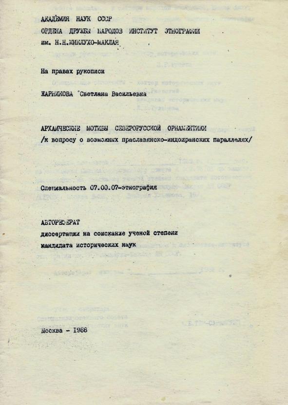 5. Вопросу о возможных общих истоках некоторых образов архаической мифологи», сохранявшихся в «Ригведе» и «Авесте» — с одной стороны, и в северорусской орнаментальной традиции — с другой.