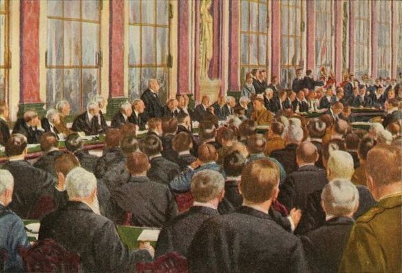 Signing the Peace Treaty in the Hall of Mirrors, Palace of Versailles, on June 28, 1919. Georges Clemenceau, French Premier, is standing and inviting the German delegates to affix their signatures to the document.