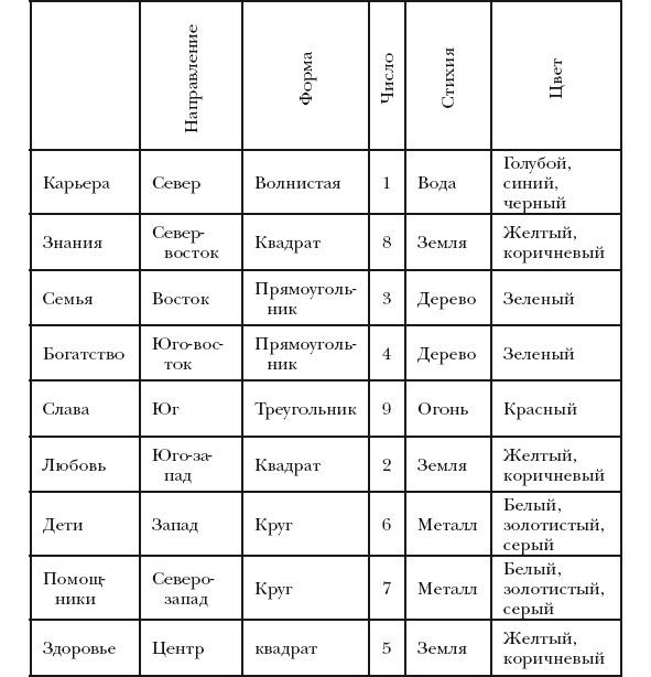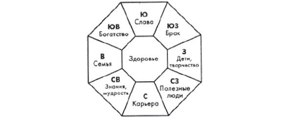 Зона карьеры (которая, как и остальные зоны занимает 45 градусов или квадратик) находится на севере, зона помощников, наставников и путешествий на северо-западе, зона знаний и мудрости на северо-востоке, зона славы на юге, зона любви, брака и хороших отношений в социуме на юго-западе, зона здоровья в центре, зона семьи на востоке, зона детей и творчества на западе, зона богатства на юго-востоке.