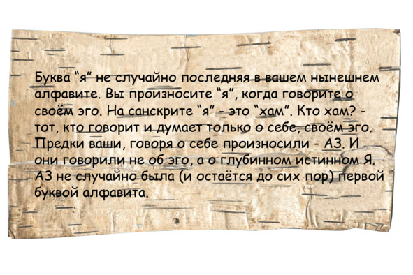 Согласно ведению древних мудрецов, семь линий азбуки по семь букв в каждой отражают смысл бытия — Сошествие Духа (Сознания) к Земле (Материи) по семи ступеням. Первая буква «Аз» не соответствует нынешнему «я». Говоря «Аз» (Аз есмь), предки наши имели ввиду не эго, а Изначальную, Истинную часть Себя, высшее «Я», Чистое Сознание.