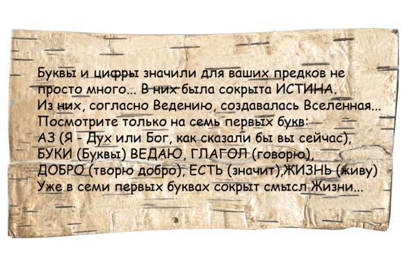 Предлагаю останавливаться и размышлять над каждой берестой и комментарием к ней хотя бы в течение недели… Вполне возможно, это поможет открыть Дверь к внутреннему вашему Ведению — гораздо большему, чем то, что записано здесь.