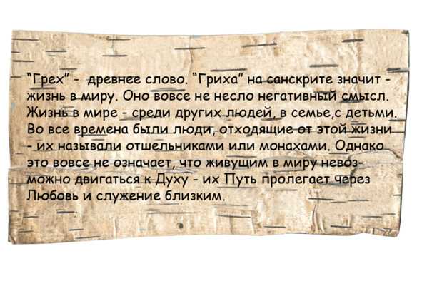 Очевидно, что, не будучи отшельником или монахом, можно также служить Исцелению человечества, пребывая в мире, любви, радости. И в миру это делать сложнее. Слово ГРЕХ, как и многие слова, обретшие негативный оттенок, вовсе не несли его изначально. Это видно из Санскрита, который не подвергался серьёзному изменению, по крайней мере, последние несколько тысячелетий. Слово ГРИХА означало — жизнь в миру, с семьёй, в сообществе других людей.